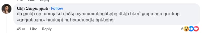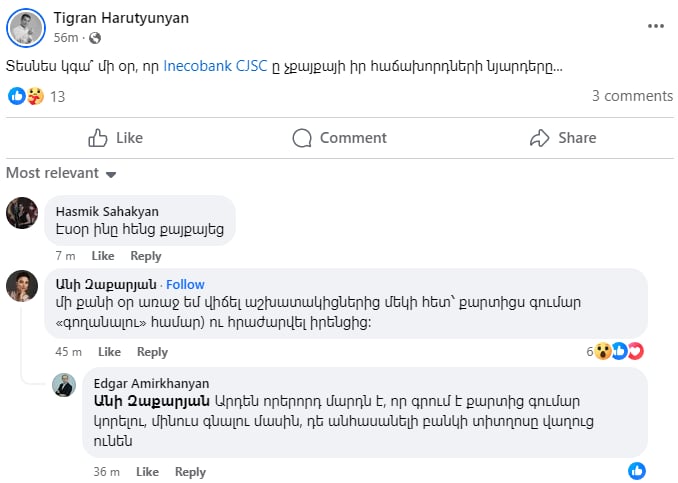 Անի Զաքարյանն այս մեկնաբանությունը թողել է հեռուստառադիոհաղորդավար Տիգրան Հարությունյանի հետևյալ գրառման տակ.