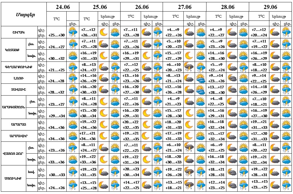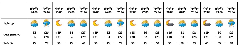 Երևան քաղաքում hունիսի 24-ի, 26-ի և 29-ի երեկոյան ժամերին քաղաքի առանձին հատվածներում հնարավոր է կարճատև անձրև և ամպրոպ, սպասվում է նաև քամու ուժգնացում ամպրոպի ժամանակ՝ 16-20 մ/վ, երեկոյան ժամերին՝ 11-14 մ/վ արագությամբ։
