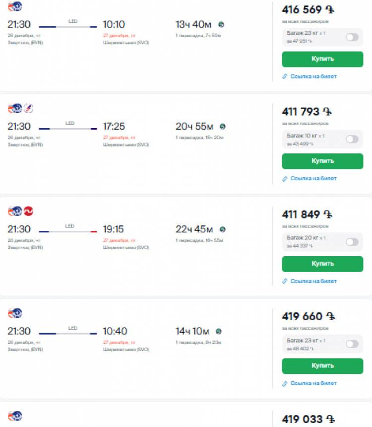 Ըստ kupibilet․ru տոմսերի ամրագրման օնլայն հարթակի այսօրվա՝ դեկտեմբերի 27-ի դրությամբ Մոսկվա-Երևան ուղղությամբ թռիչքի տոմսերի արժեքը սկսվում է 53 հազար դրամից, և հասնում մինչև 419 հազար դրամ։